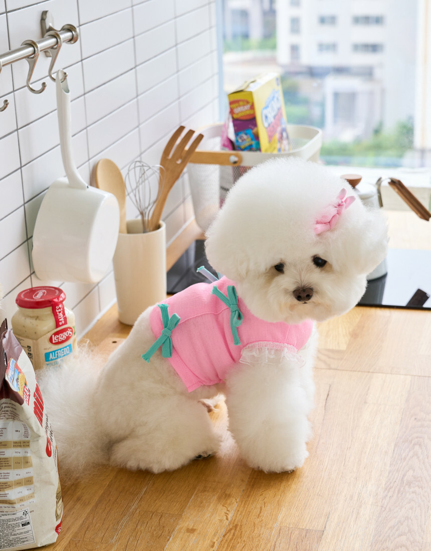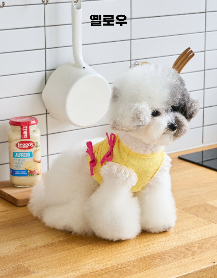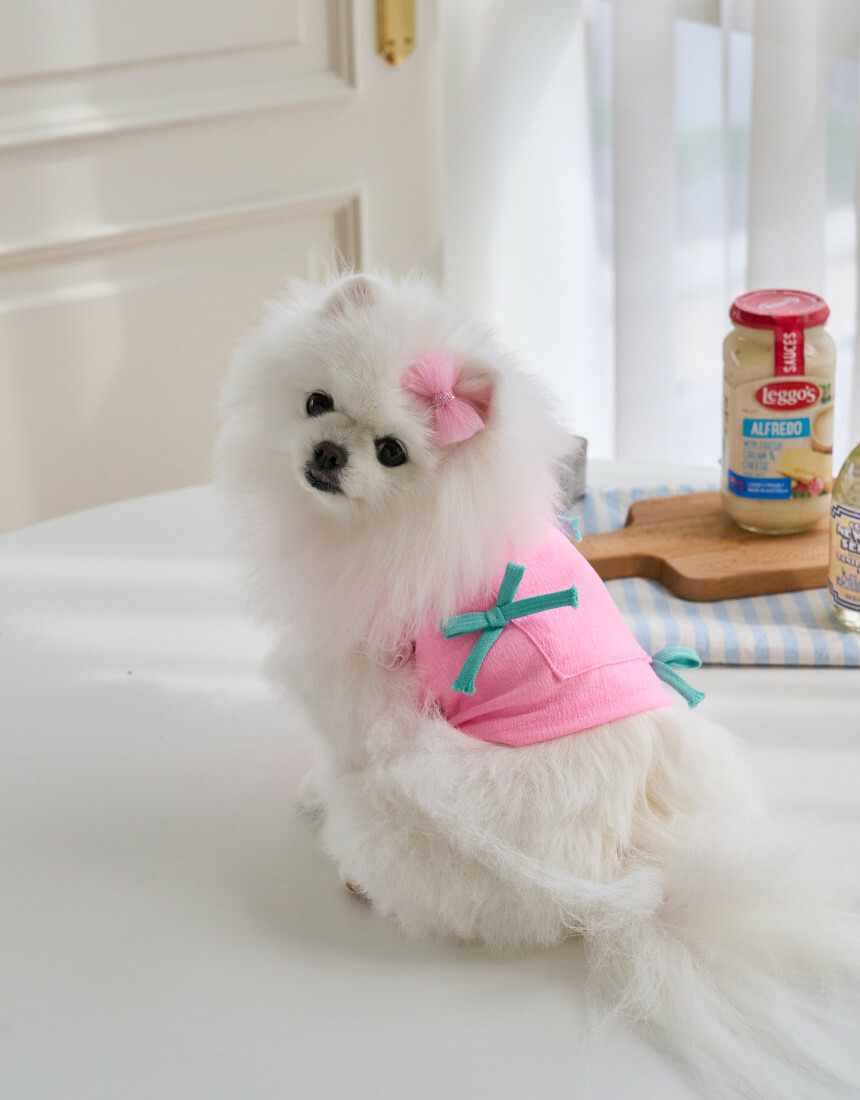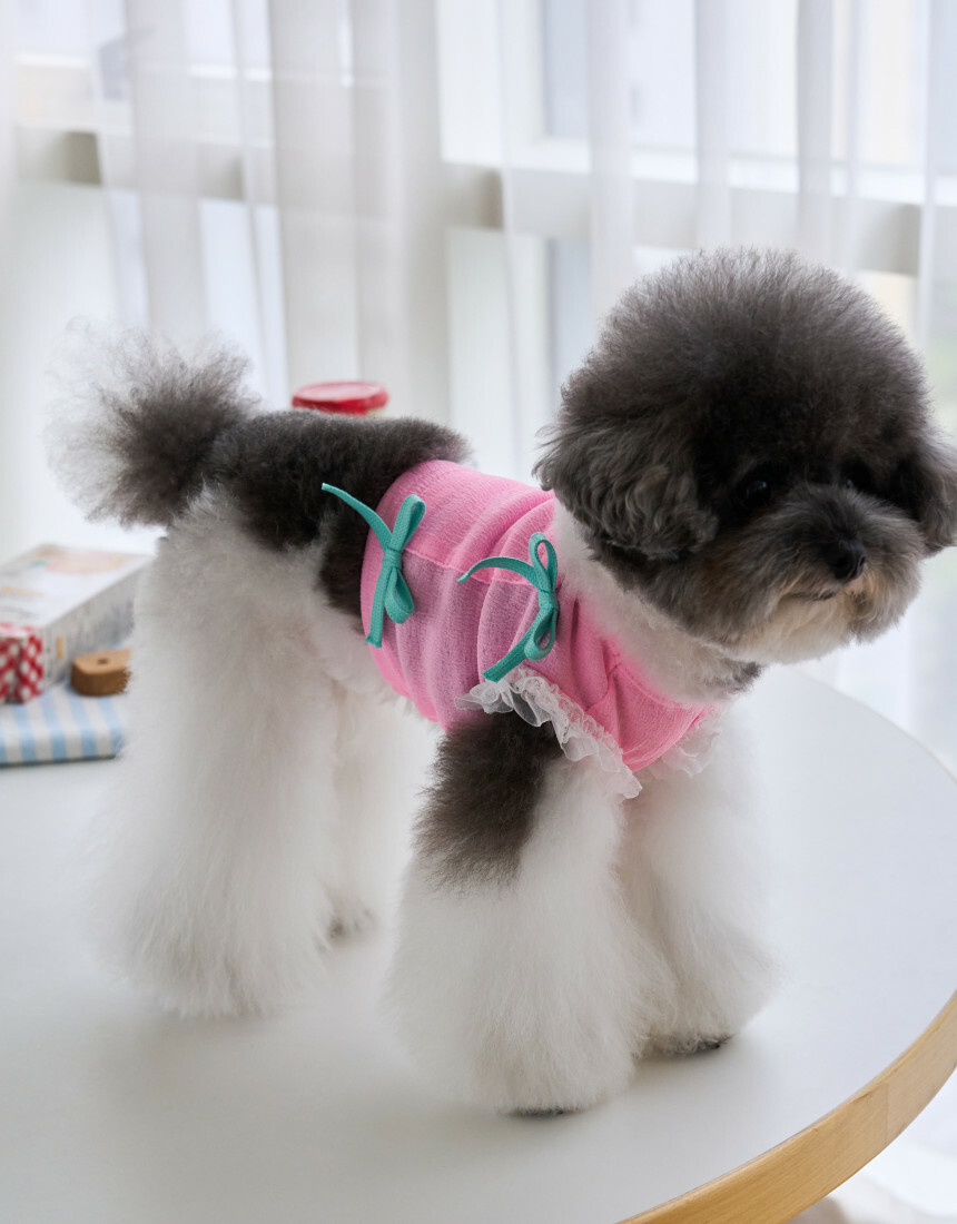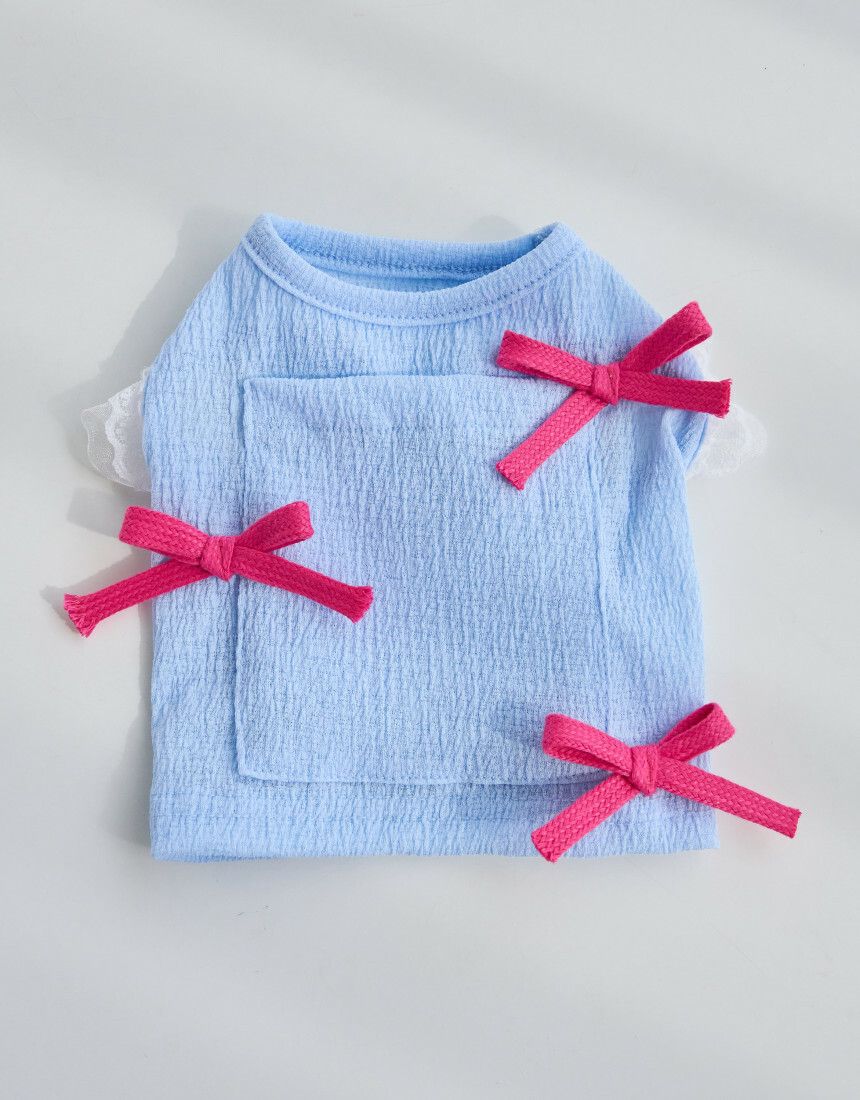 亮麗的多巴胺色調:粉紅/黃/藍色,加上撞色的可愛小蝴蝶結裝飾,無袖與蕾絲滾邊,簡單又細節滿滿的實用款~