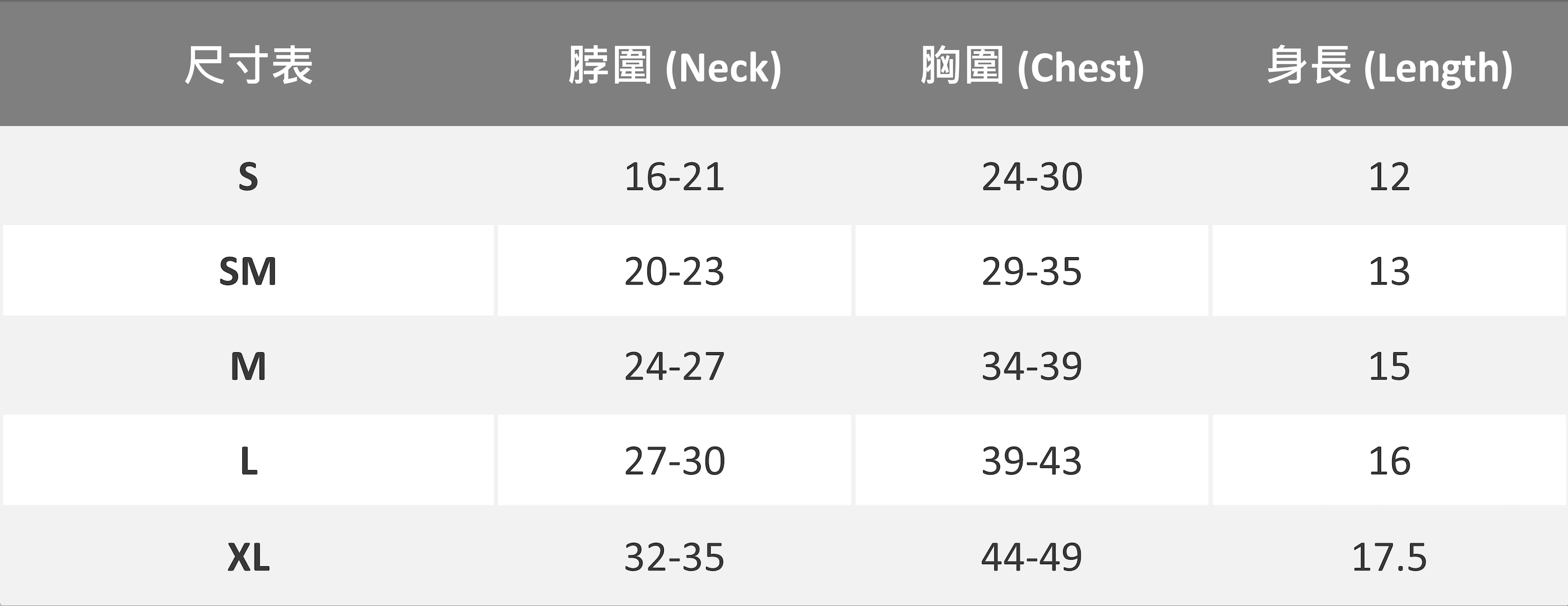 2. 尺寸選擇請以胸圍為主,衣長穿著起來的長度會因版型與狗狗身材而有不同。